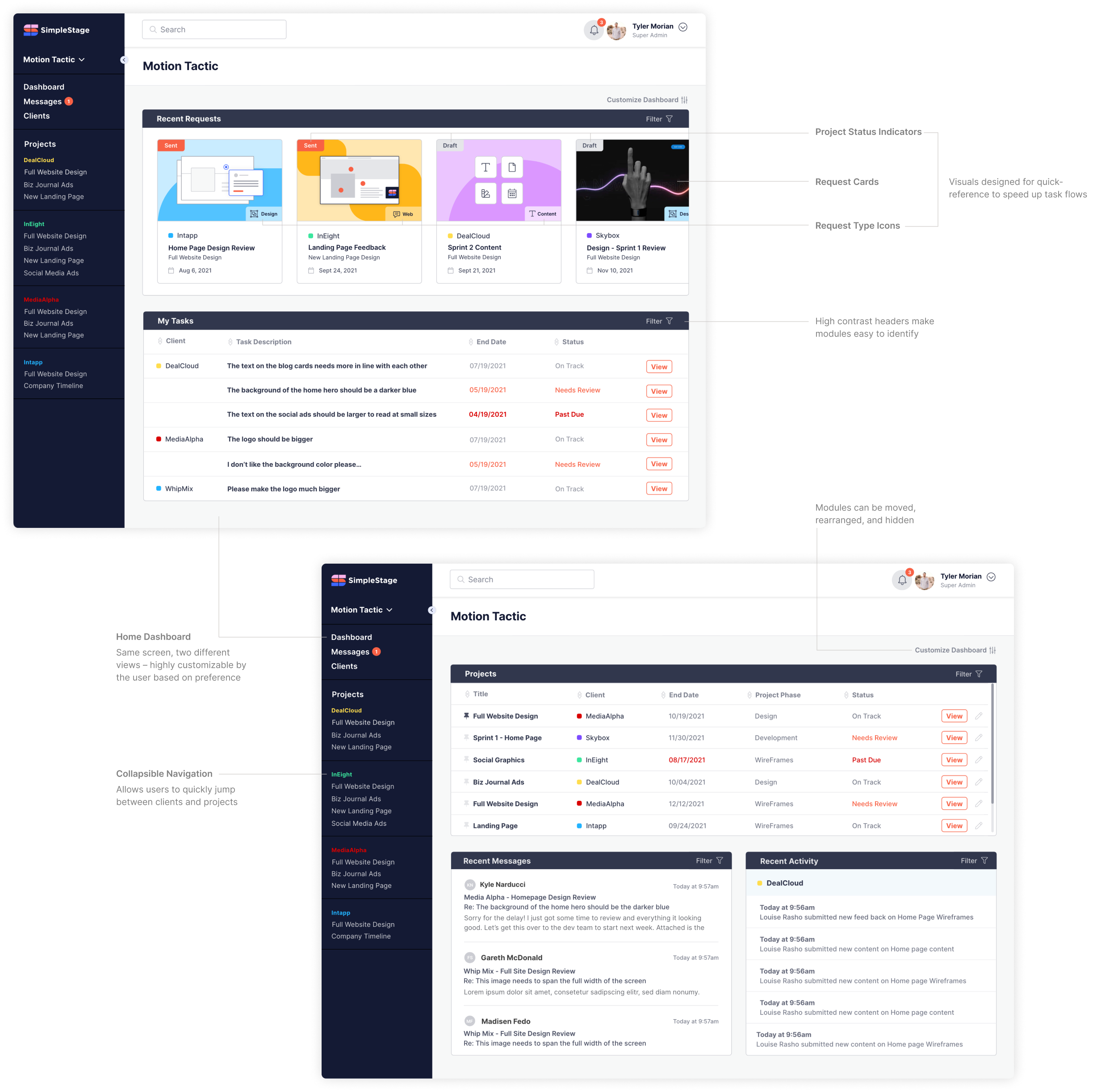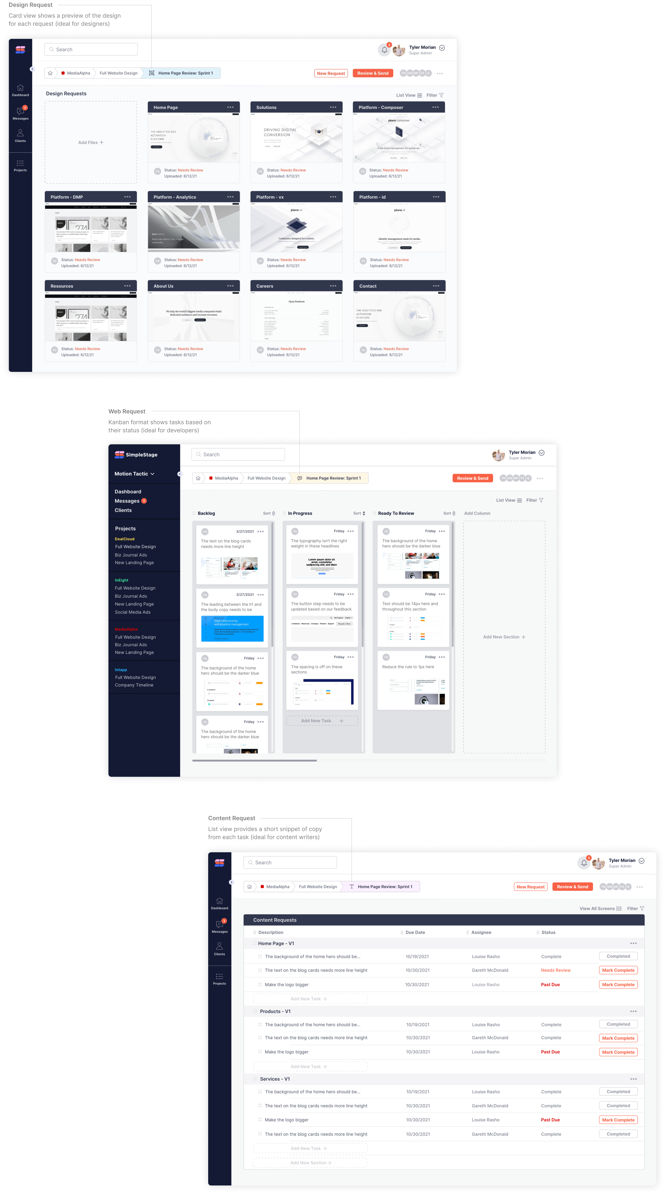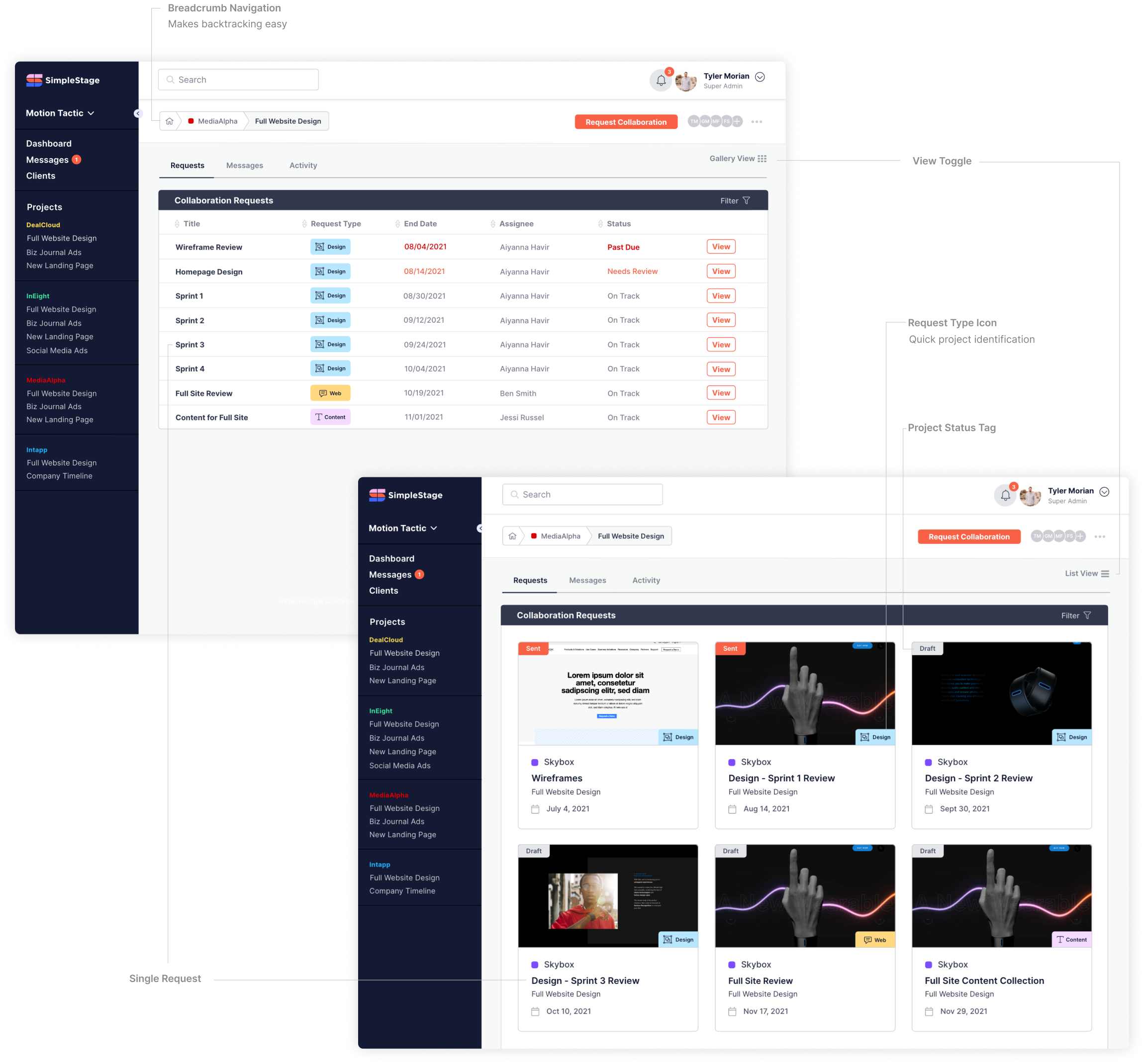 Displays all requests, messages, and activity for each project in both list and gallery layouts to accommodate users preferences.