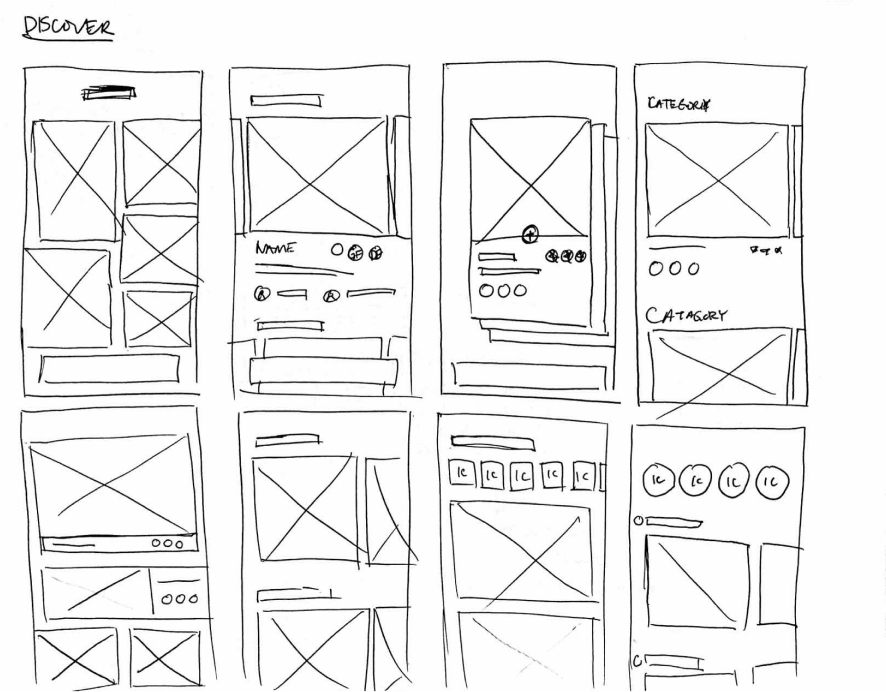 To kick-off the design process, quick sketches helped me get ideas on paper to establish which elements were necessary for each screen. A low fidelity prototype was then created for initial user testing.