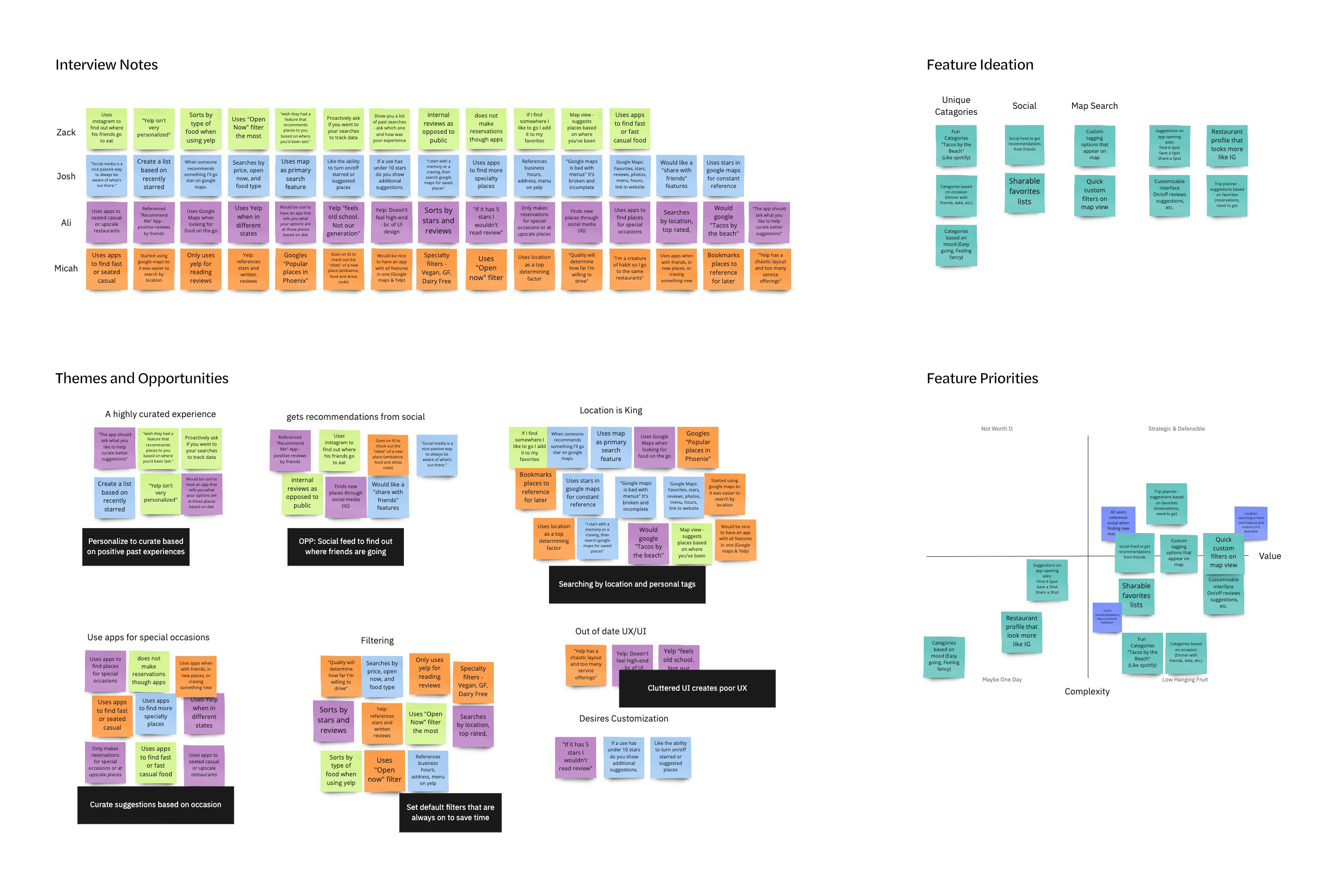 After conducting user interviews, all the participants responses were synthesized to identity themes, opportunities, and features that YUM could focus and improve upon.