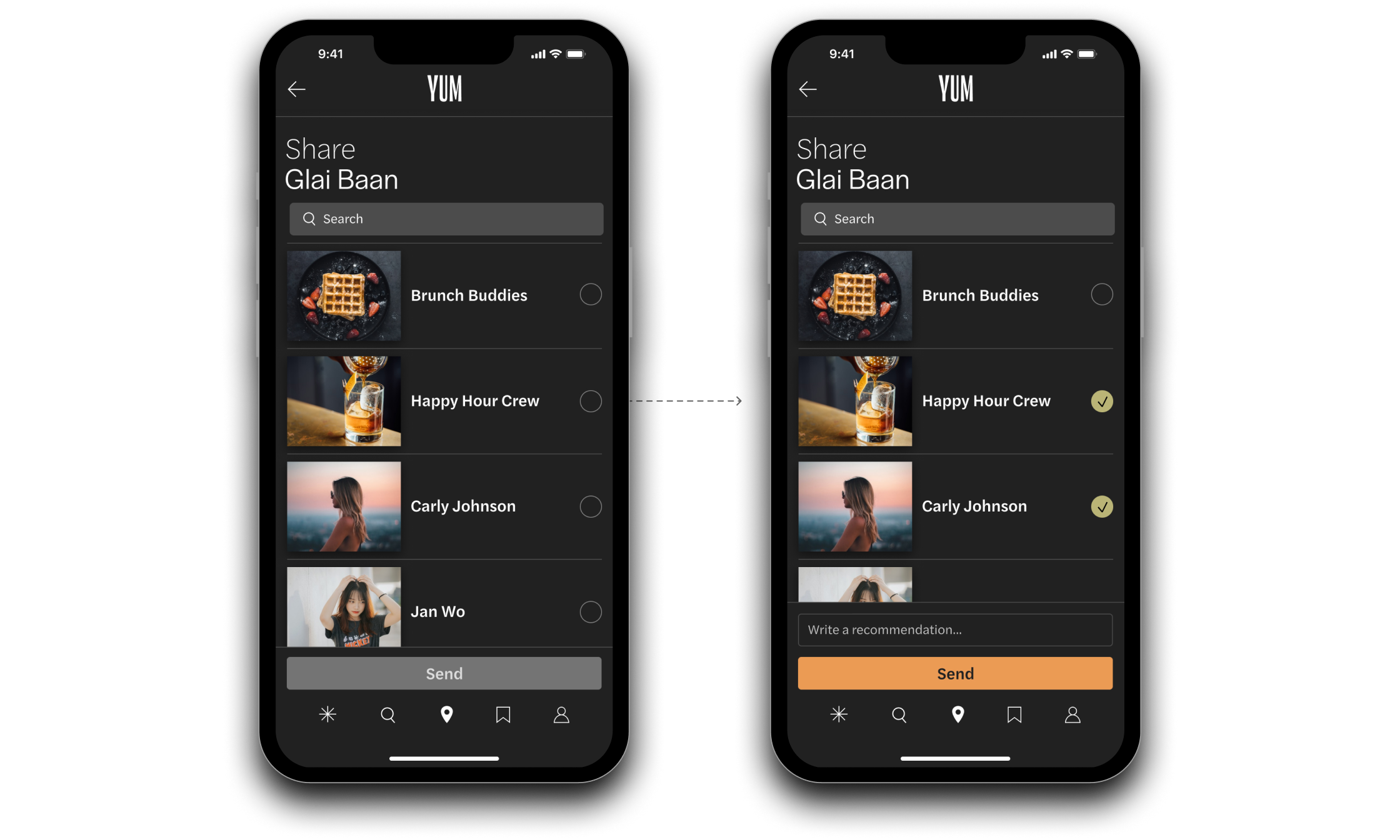 YUM recommends restaurants based on a users location, friends, saved restaurants, and their positive posts and reviews.