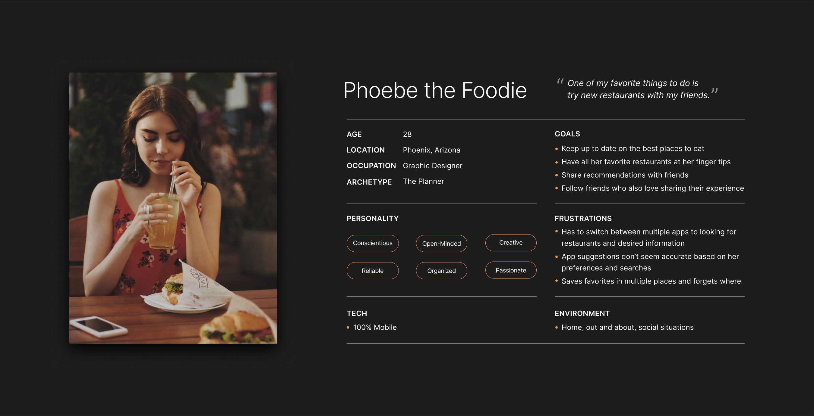 Millennial foodies are frustrated with the current products they use to find restaurants that fit their preferences. While there are multiple apps to solve this problem, none successfully provide users with all the features they want to make a confident decision in one seamless experience. Instead, they flip between multiple apps to search and cross check what they find on the others, which makes for a very clunky and time consuming task.